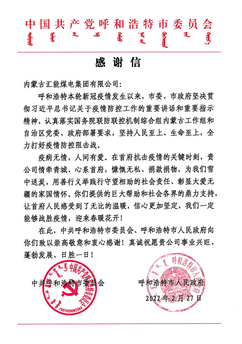 一封來自中共呼和浩特市委員會、呼和浩特市人民政府的感謝信